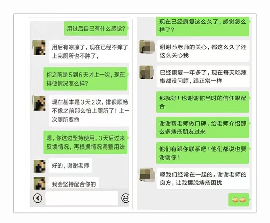 后来去医院时候相识的几个“痔”友听说我的痔疮好了,问我方法,我把微信号推荐给他们,没想到他们也同样脱离了痔疮的苦海!一个外痔的用了20天的时候说外痔没了,另外两个一个内痔脱出还一个跟我一样混合痔的也都好了!